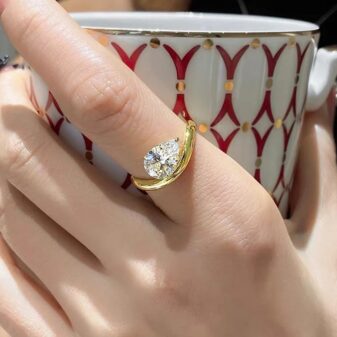The centerpiece of the ring is a large, sparkling pear-cut diamond, which is known for its elegant teardrop shape. What makes this ring particularly distinctive is its bypass or tension-style setting. The stone is not held in place by a traditional prong setting but appears to be suspended between two ends of a thick, curved…