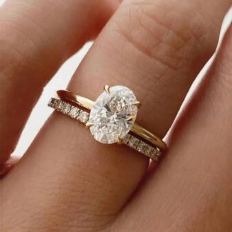 The rings are worn together, showcasing a classic bridal set. The main ring is a solitaire engagement ring featuring a large, brilliant oval-cut diamond as the center stone. The diamond is set in a four-prong setting, which allows for maximum light to enter the stone, enhancing its sparkle. The band of this ring is a…