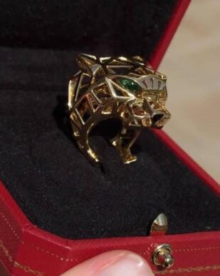 Each bangle is a cuff-style bracelet with an open front. One end of the cuff features a detailed panther head, while the other is an articulated or curved tail section. The ring has a similar panther head design. Materials and Embellishments: The jewelry is embellished with a combination of clear and dark-colored stones, simulating the…