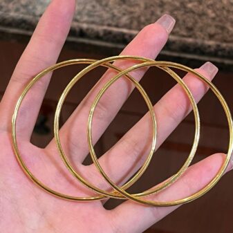 This close-up image features a person’s hand holding a delicate, gold-toned bracelet. The bracelet is a thin, solid bangle with a polished, shiny surface. It appears to have subtle markings or a textured finish along its surface, which catches the light. Attached to the clasp is a small, golden charm that looks like a miniature…