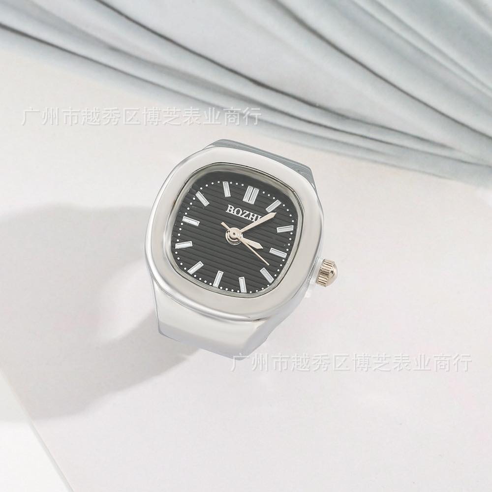 The band of the ring is a wide, solid piece of metal that seamlessly connects to the watch’s casing. The design is sleek and modern, offering a functional accessory that can be worn as a statement piece of jewelry.