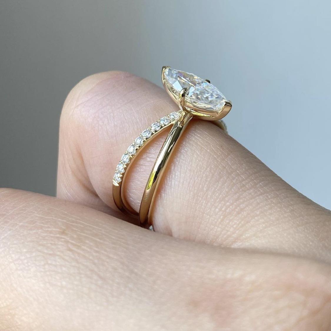• The right side of the image shows a side profile view of the same ring, held between two fingers. This angle clearly displays the intricate double-band structure and the raised setting of the marquise diamond. It emphasizes the elegant, flowing lines of the design and the way the two bands separate and come together.