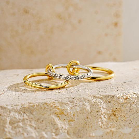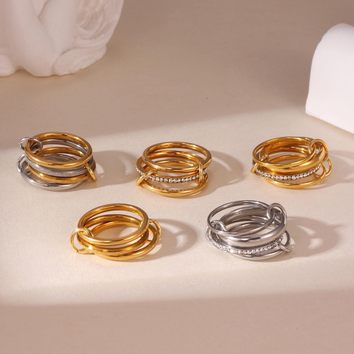 A stylish combination of two gold and one silver-toned ring, showcasing a modern, interlocking design.