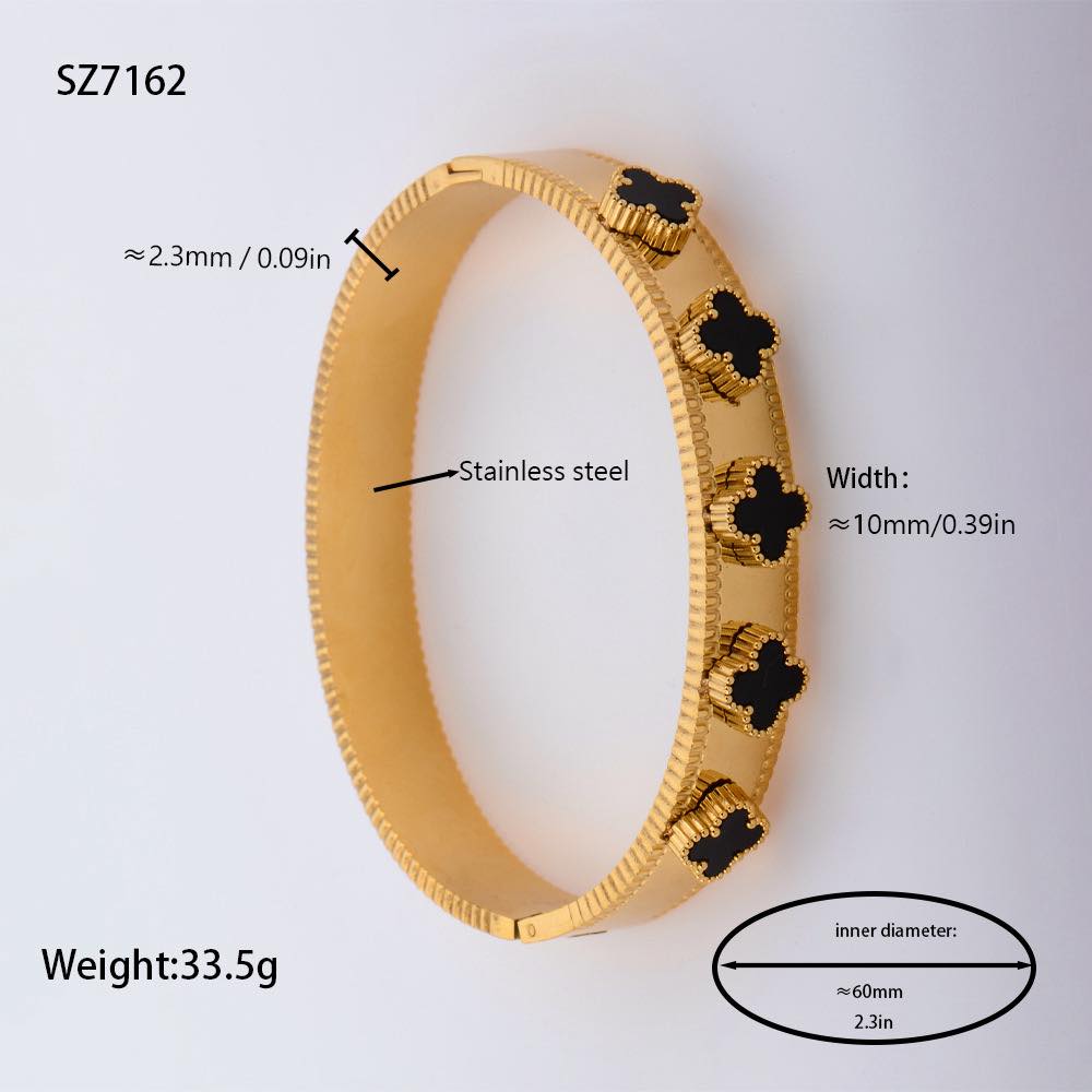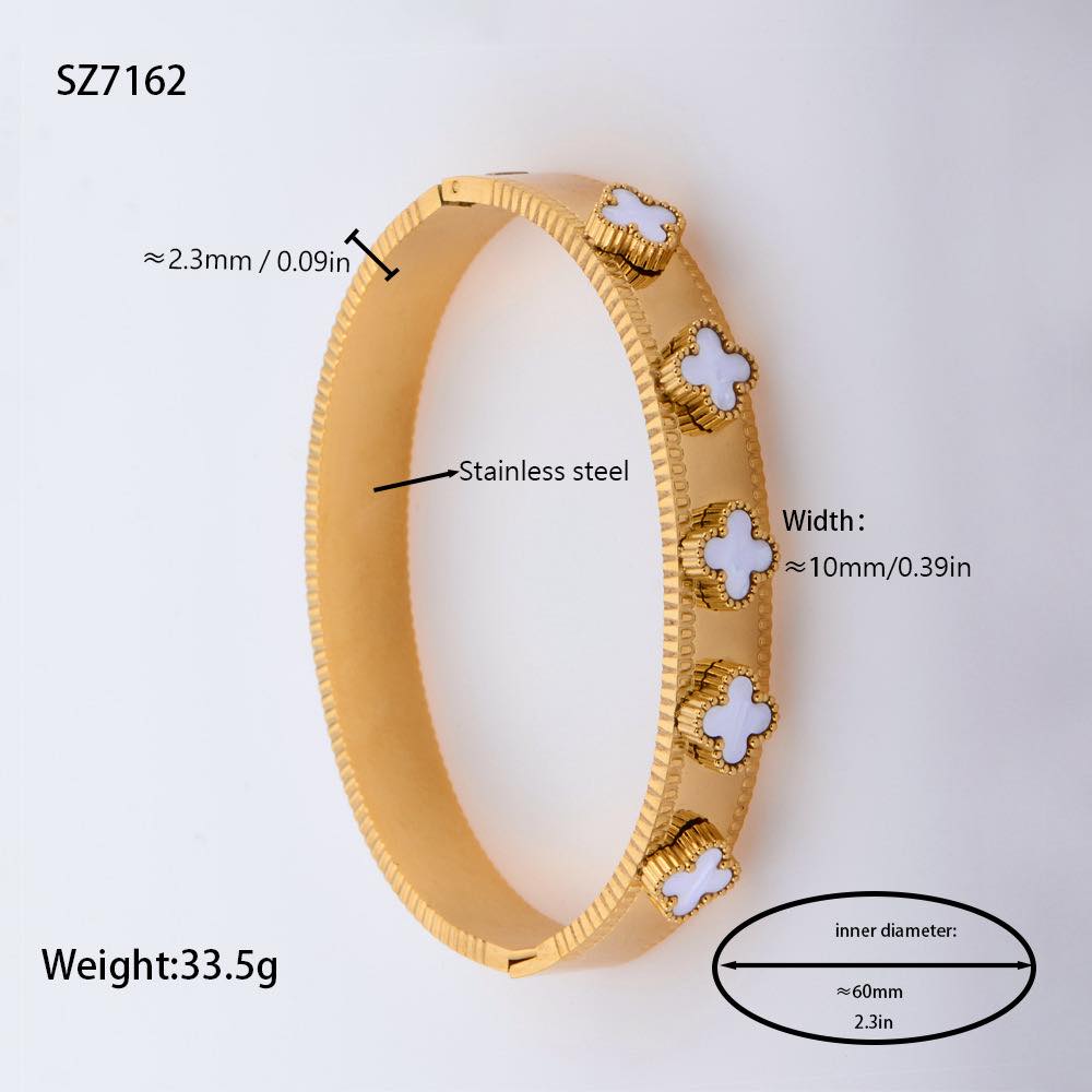 This delicate bracelet features a series of four-leaf clover motifs, each linked to the next to create a continuous, elegant chain. The golden sheen of the metal is beautifully complemented by the pearlescent white inlay in each clover. This classic design is both a stylish accessory and a timeless symbol of luck, hope, and good fortune.