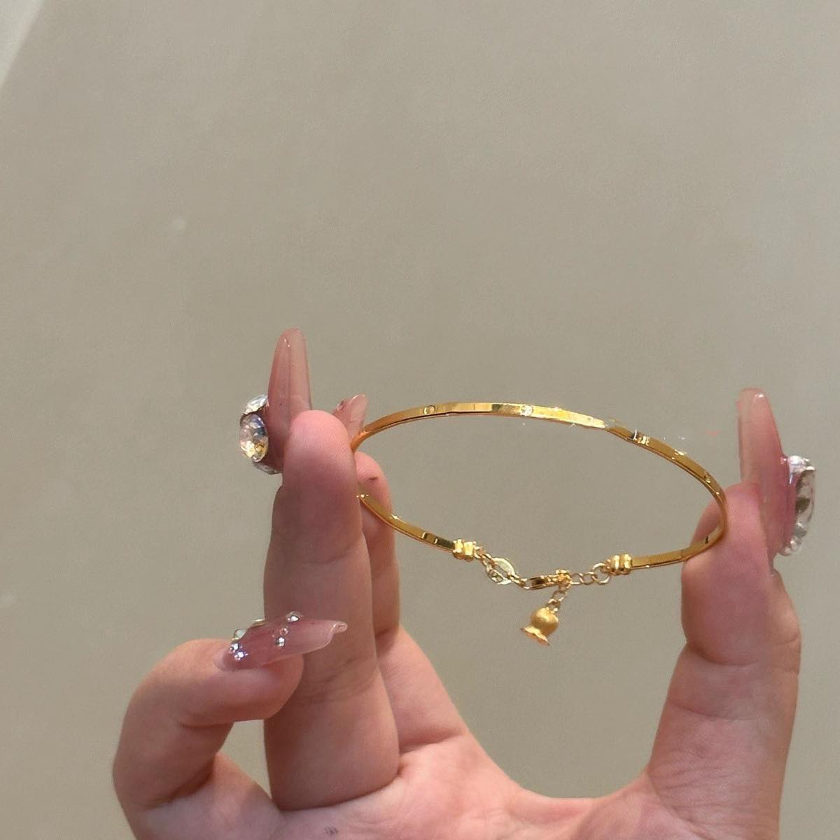This close-up image features a person’s hand holding a delicate, gold-toned bracelet. The bracelet is a thin, solid bangle with a polished, shiny surface. It appears to have subtle markings or a textured finish along its surface, which catches the light.