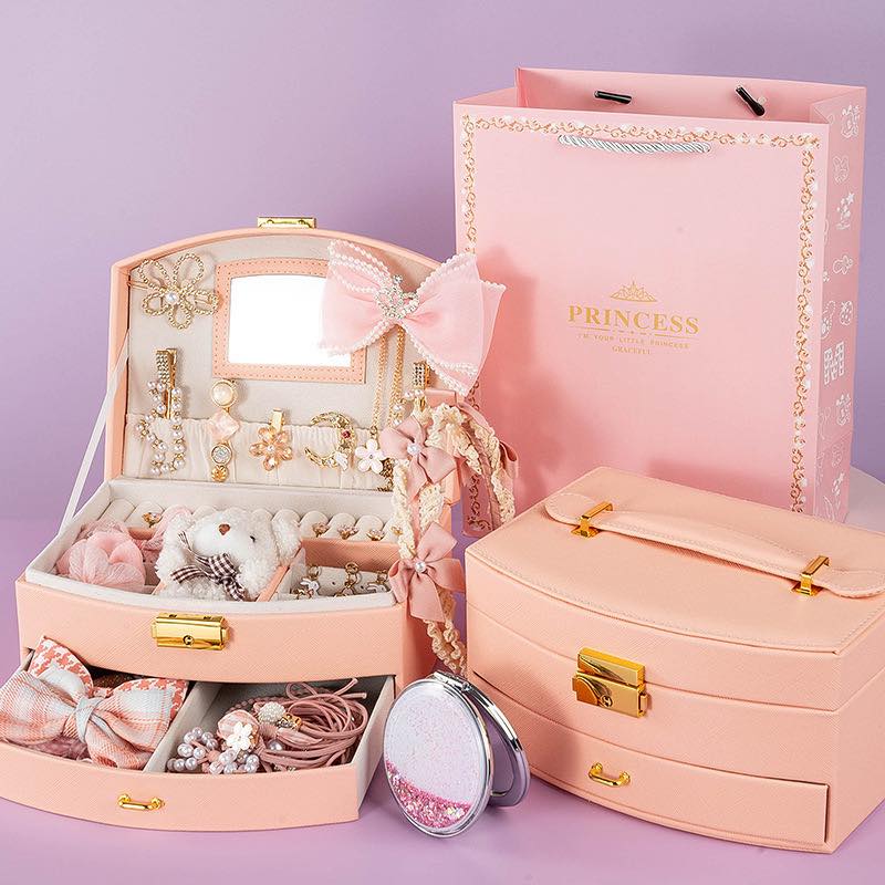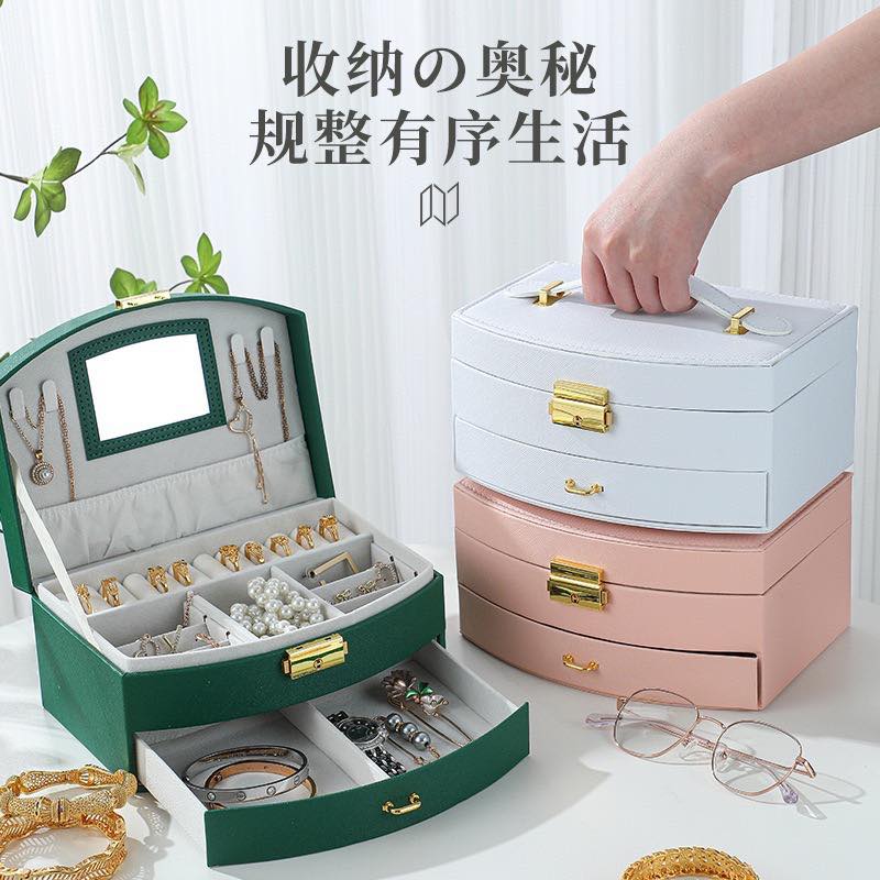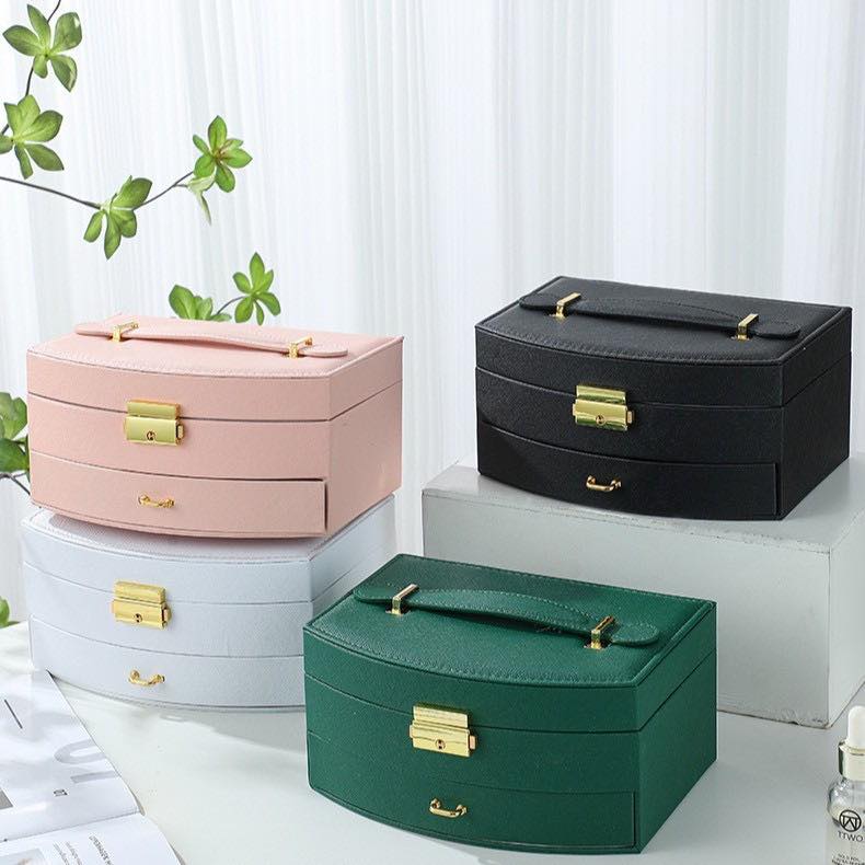 These are elegant and compact two-tiered jewelry boxes, perfect for organizing and protecting your accessories. Each box is covered in a soft, smooth leatherette material and is available in three stylish colors: crisp white, classic black, and a soft, delicate pink. The boxes have a sleek, modern design with rounded corners. The top compartment is secured with a clean, gold-toned latch and includes a sturdy top handle for easy carrying. A small drawer with a matching handle slides out from the bottom, providing a second, convenient storage space. These boxes offer a blend of functional design and sophisticated aesthetics, making them a beautiful addition to any vanity or dresser.