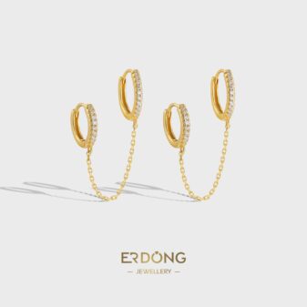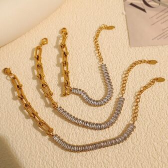 This is a contemporary and striking bracelet that offers a bold, two-part design. One half of the bracelet features a chunky, architectural gold-toned link chain with a unique bead detail in the center of each link. The other half is a continuous, radiant band of rectangular cubic zirconia stones, set side-by-side to create a dazzling,…