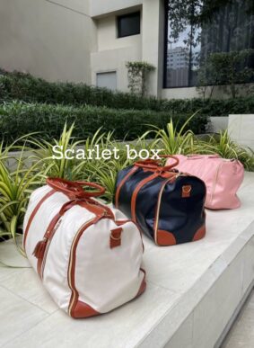 Key features of the bags: Pu leather travel bag Color Scheme: The bags come in three different colors: White/Cream: The bag closest to the camera is a clean white or cream color, with prominent brown leather or faux leather accents. Black: The middle bag is a sleek black, also with the same brown accents. Pale…