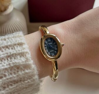 Details of the watches: Design: All four watches share a similar bangle-style strap that opens to fit around the wrist. The straps are smooth and polished. Dial Variations: The primary difference between the watches is their face and bezel design: Watch 1 (on the wrist): This watch has a white or cream-colored dial with gold-toned…