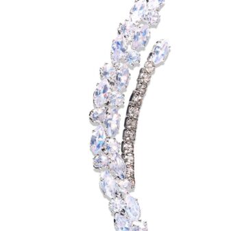 This beautiful gold-plated cuff bracelet is a statement piece with intricate details. The cuff’s surface features a repeating, textured scallop or bead pattern along the top and bottom edges, framing a central row of ornate, four-petal floral motifs. Each of these flower-like emblems is composed of delicate cubic zirconia stones, creating a dazzling effect. The…
